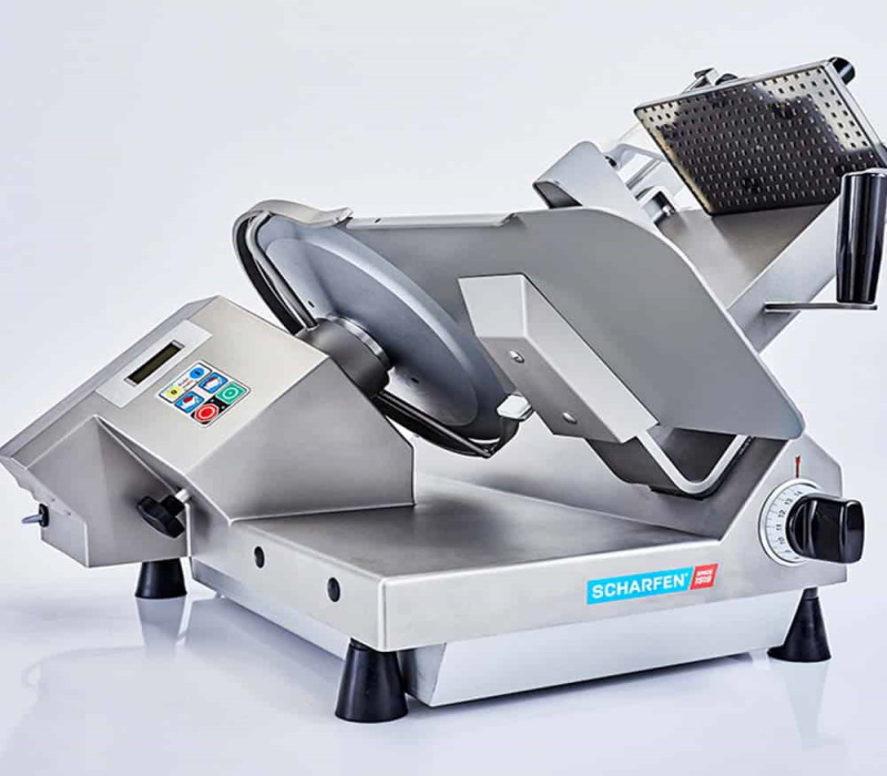13” hollow ground/hard chromed/ stay sharp blade (toothed blade available for bread), ½ HP, Power Grip Belt Drive allows for continuous operation with high power transmission, carriage can be tilted aside for easy cleaning, Teflon carriage/thickness plate/blade guard/blade option available for slicing cheese/bread/meats with ease of cleaning (G 330 F Teflon), grinding device removable, 0-25mm slice thickness (0-1”), L 700mm (27.6”) x D 790mm (31.1”) x H 550mm (21.6”), 48 kg (105 lbs), various electrical specifications available upon request